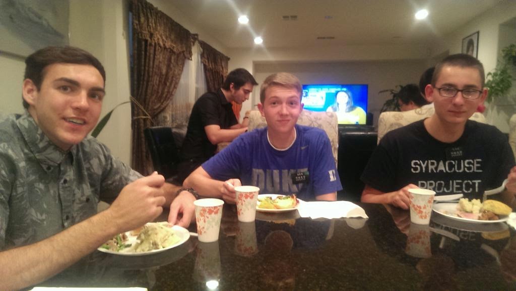 Thursday! We woke up and met with the other missionaries to open presents and have breakfast. Thank you! I am sorry you thought I was disappointed! I love getting all the pictures of everyone with the chalk sign and hat! The water bottle is awesome, and I like the running clothes. BTW the laces on one running shoes snapped... After we Skyped! It was fun, I felt a little awkward though. Sorry it was so short. I love you guys! After that we had linner at a member's house and then just chilled until dinner and volley ball at the chapel afterwards.